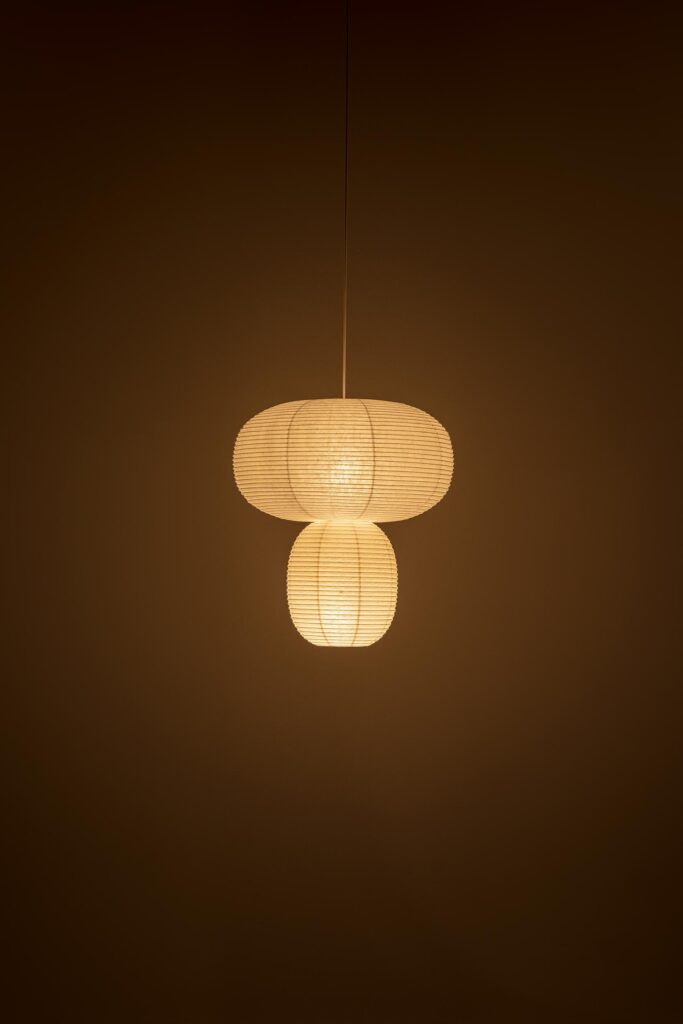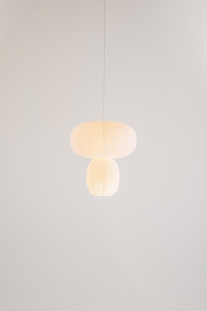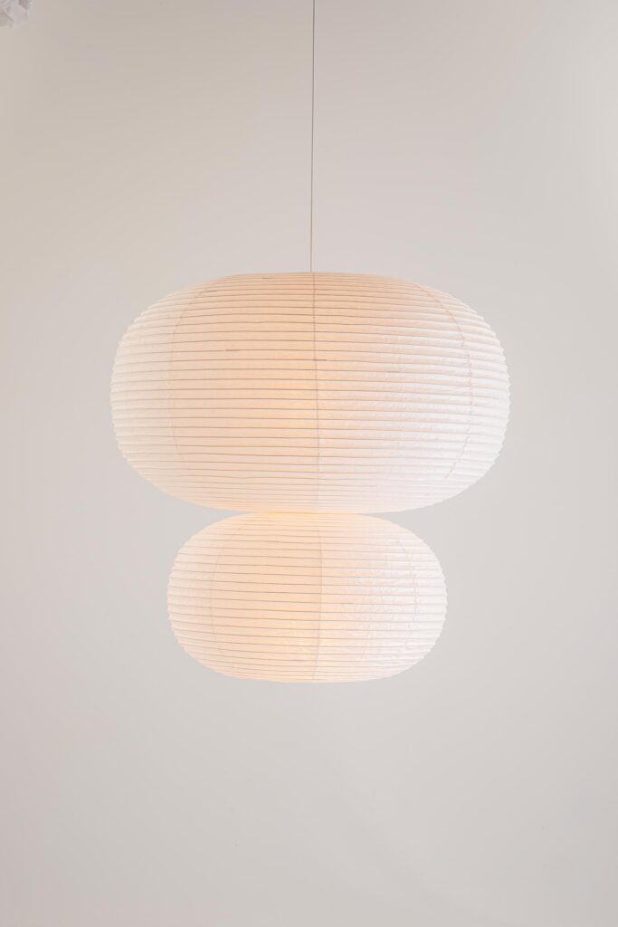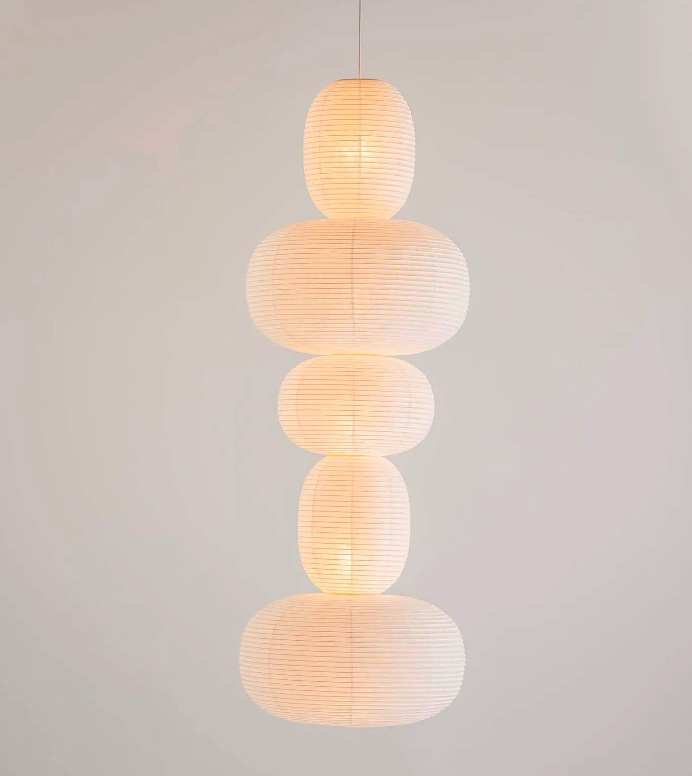 堅牢な作りを誇る水府提灯と大きなサイズの和紙を漉くことができる石州和紙だからこそ、これほどまでの大きな提灯を作ることができました。自然素材と日本の伝統から生まれた光の造形がモダンな空間を照らし、豊かな情景を生み出します。