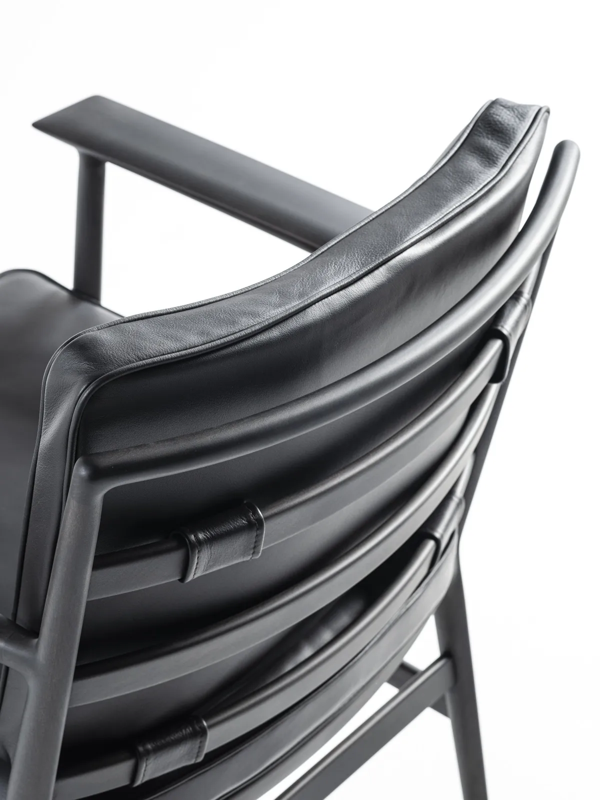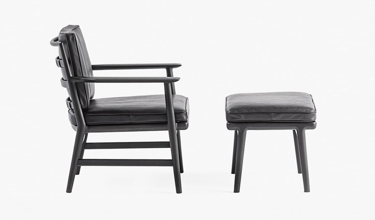 また、コンパクトなサイズ感は、リビングやラウンジ空間をはじめ、書斎などのプライベート空間でも使いやすいボリュームとしました。空間に落とし込まれた姿を想像し、ラダー状の背板とすることで、フレームとクッションの親和性を高めながら背面の佇まいを独自性のあるものにしています。水平に伸びる幅広のアームは腕をしっかりと支え、ラウンジチェアの快適性を高めます。楕円形の断面形状を持つ脚部は、面の柔らかさとエッジのシャープさが共存しています。また、ルーズ感のあるクッションは、パイピングがアウトラインをシャープに見せてフレームと調和し、チェア全体に洗練された印象を与えます。