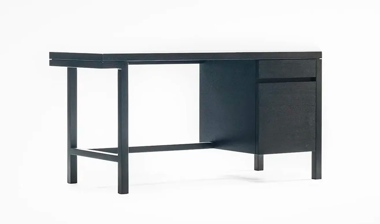 コンパクトなスペースで仕事をしたり、勉強をする時に使える小さな机です。右側には小ぶりな引き出しがあり、デスクトップにはフタ付の配 線孔を設けて、コンピューターや照明器具のコードを通せる機能を備え ました。