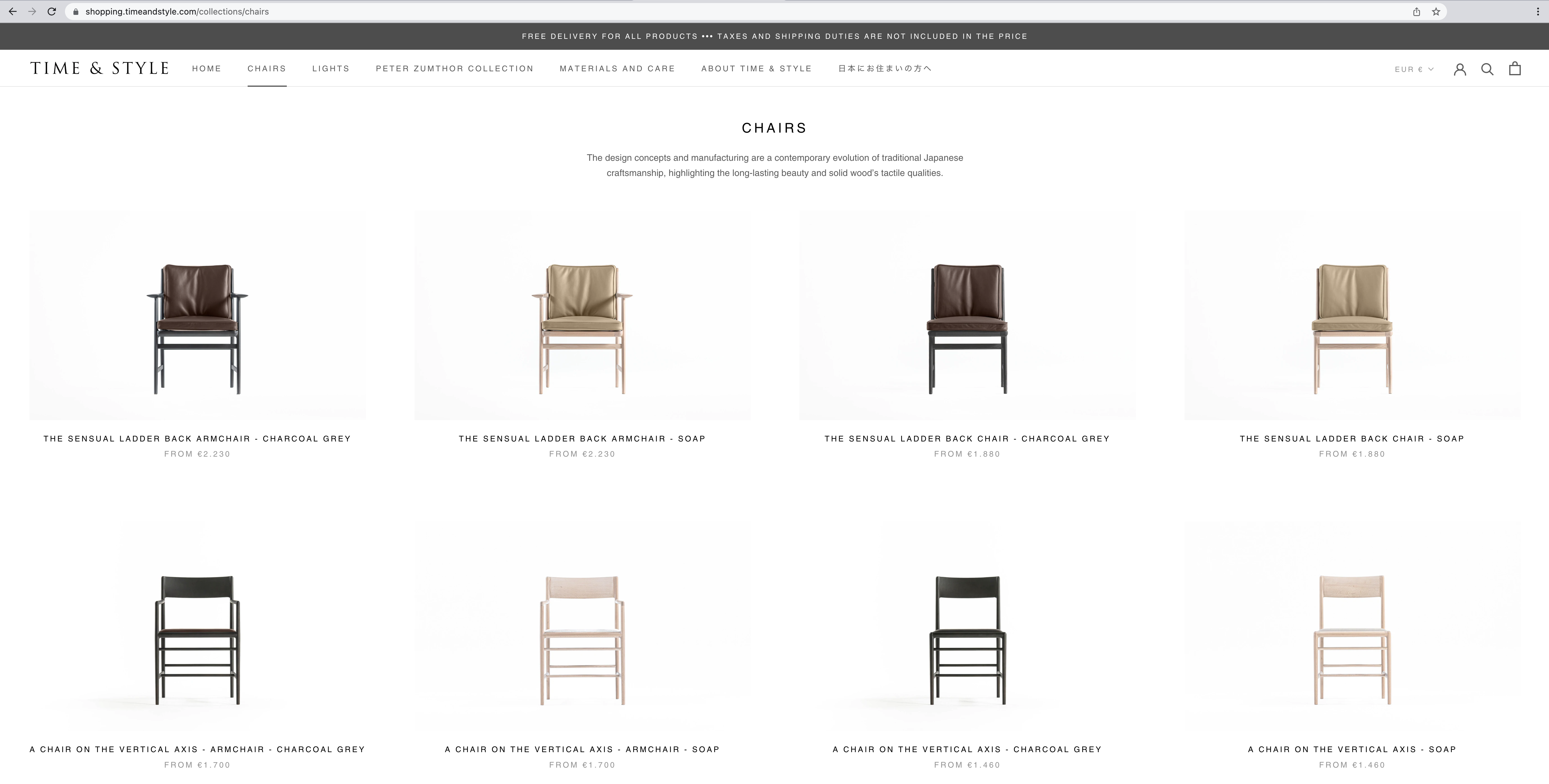 日本国外から家具をご購入いただける、インターナショナルサイト「Time & Style Online Store」がオープンしました。現在、Peter Zumthor collectionをはじめ、チェアや照明などを世界各地よりお求めいただけます。順次、製品や情報を充実させ、さらに日本向けのオンラインストアも今秋のリニューアルに向けて準備を進めておりますので、どうぞご期待ください。