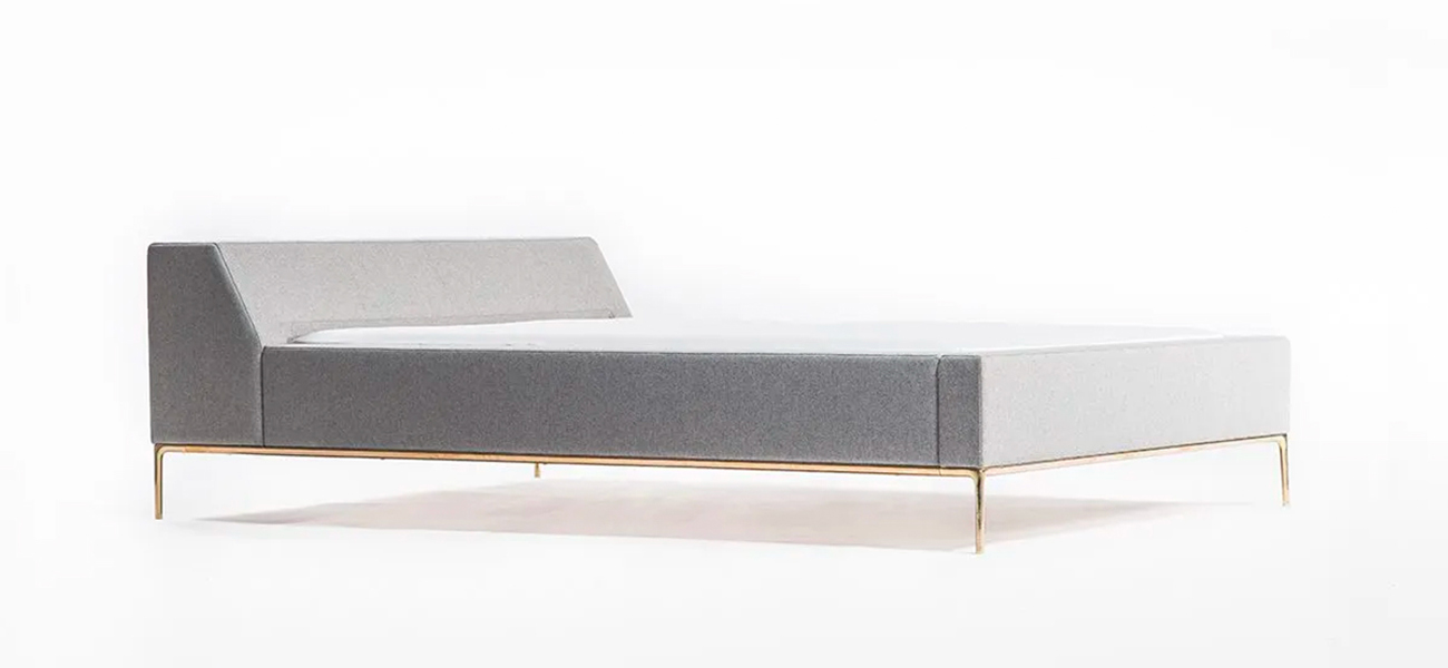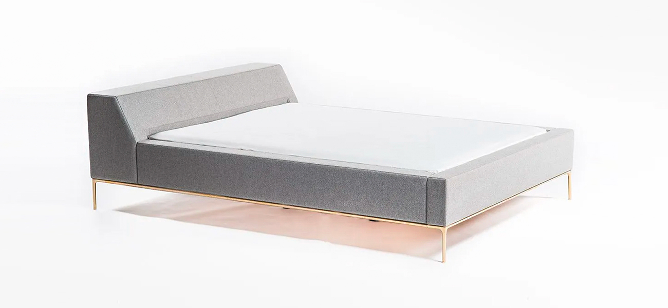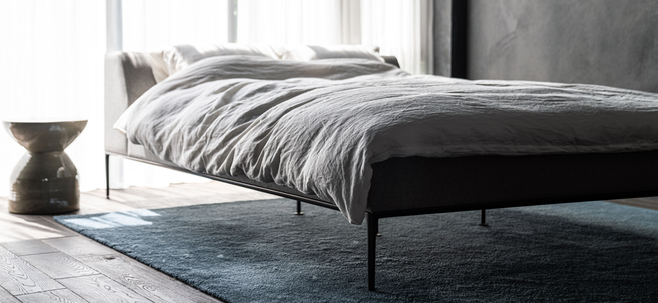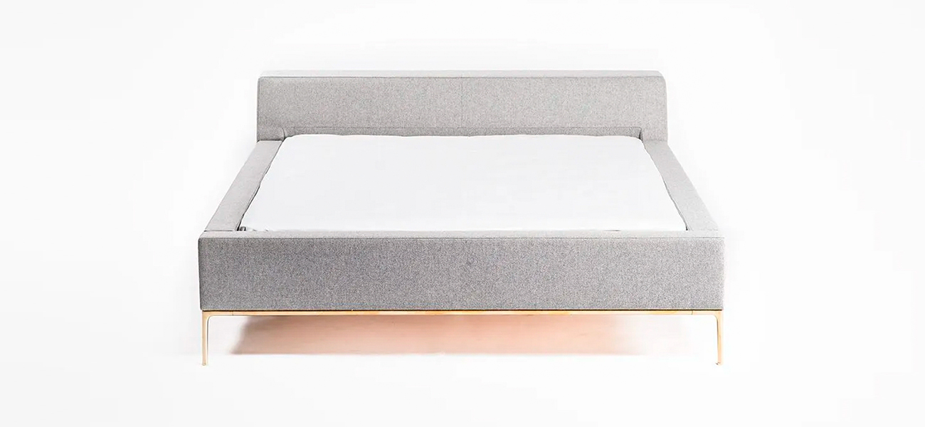 ウレタンを下地にしてファブリックを張り込んだ柔らかなフレームは、寝返りを打った時やベッドに上がる時もストレスなく快適に過ごすことができる、優しい触感に作りました。ヘッドボードを背もたれにして読書する時も、背中を優しくホールドします。体と心にストレスを与えないことが、眠りの重要な要素であると私たちは考えています。本体を支持する脚は、優しく面取りを施した真鍮製です。その輝きは特別な存在感を作り出します。