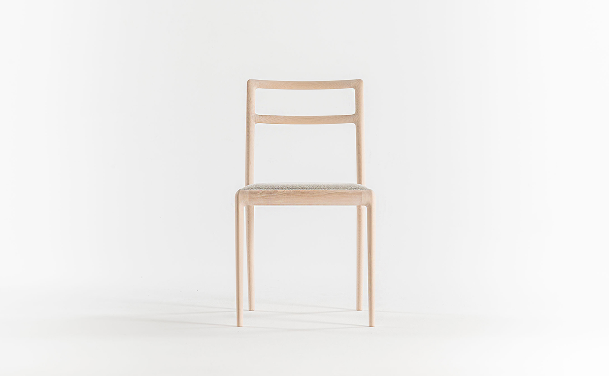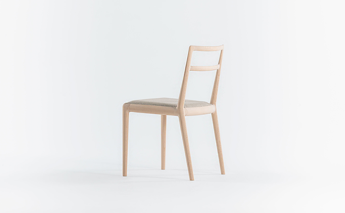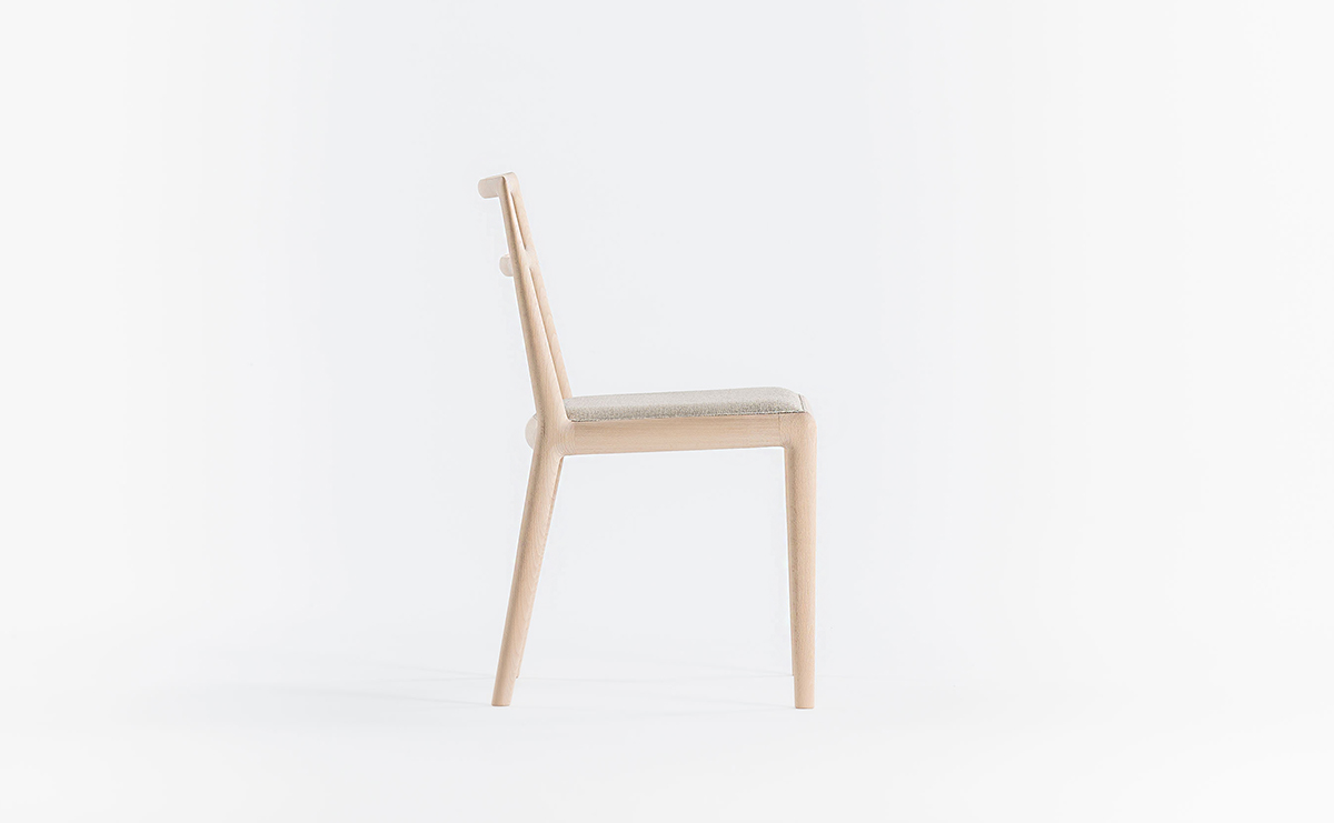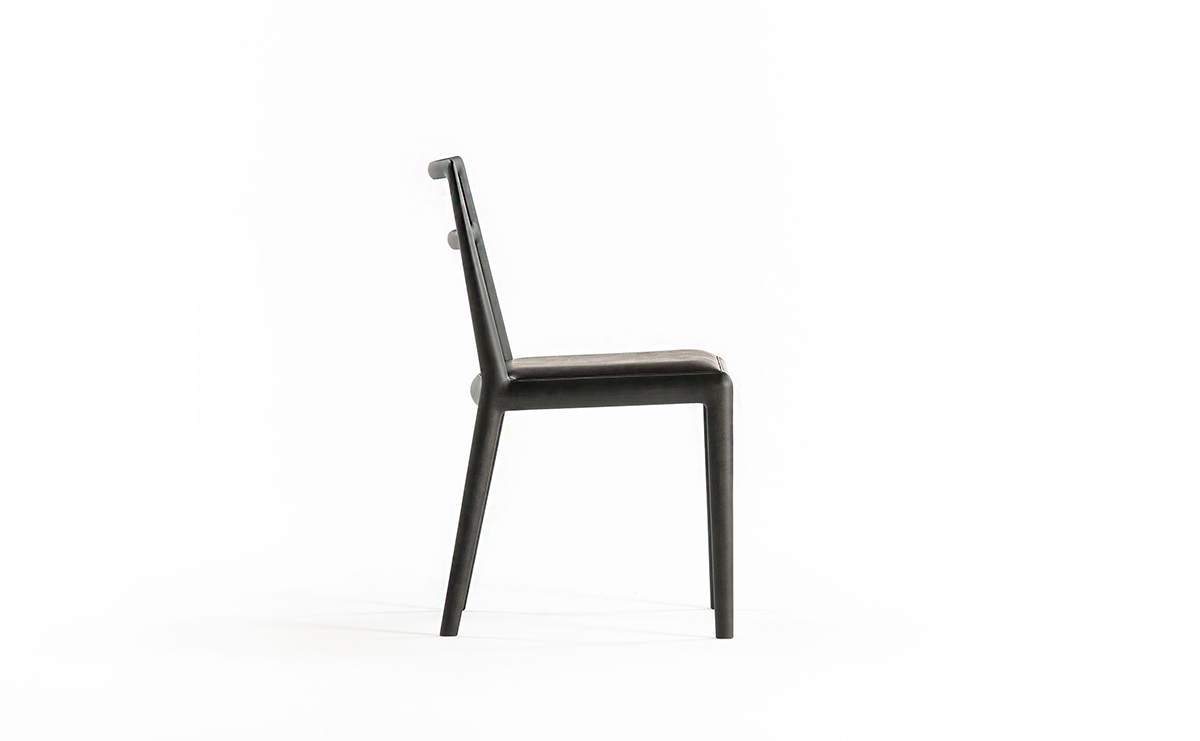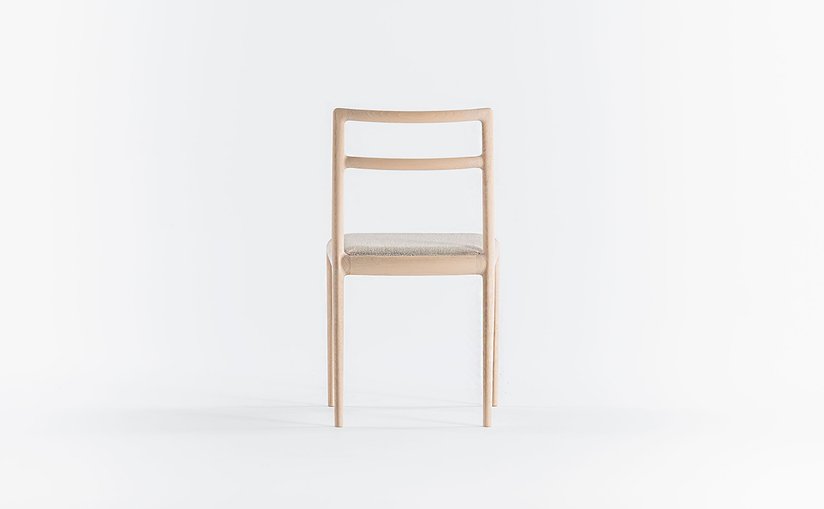 前脚と座枠と後脚は Straight back chairと同じ形状をしていますが、 背柱は途中からねじれ、背中を回り込むよう立ち上がっています。樹木の枝がひねりながら伸びている姿のように、後脚から背柱は緩やかなカーブを描いています。そうすることで優しい背当たり感が得られ、視覚的にも1 本の無垢材を彫刻のように削り出した美しさが表現できました。