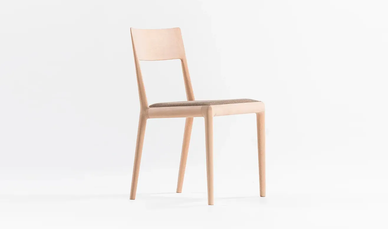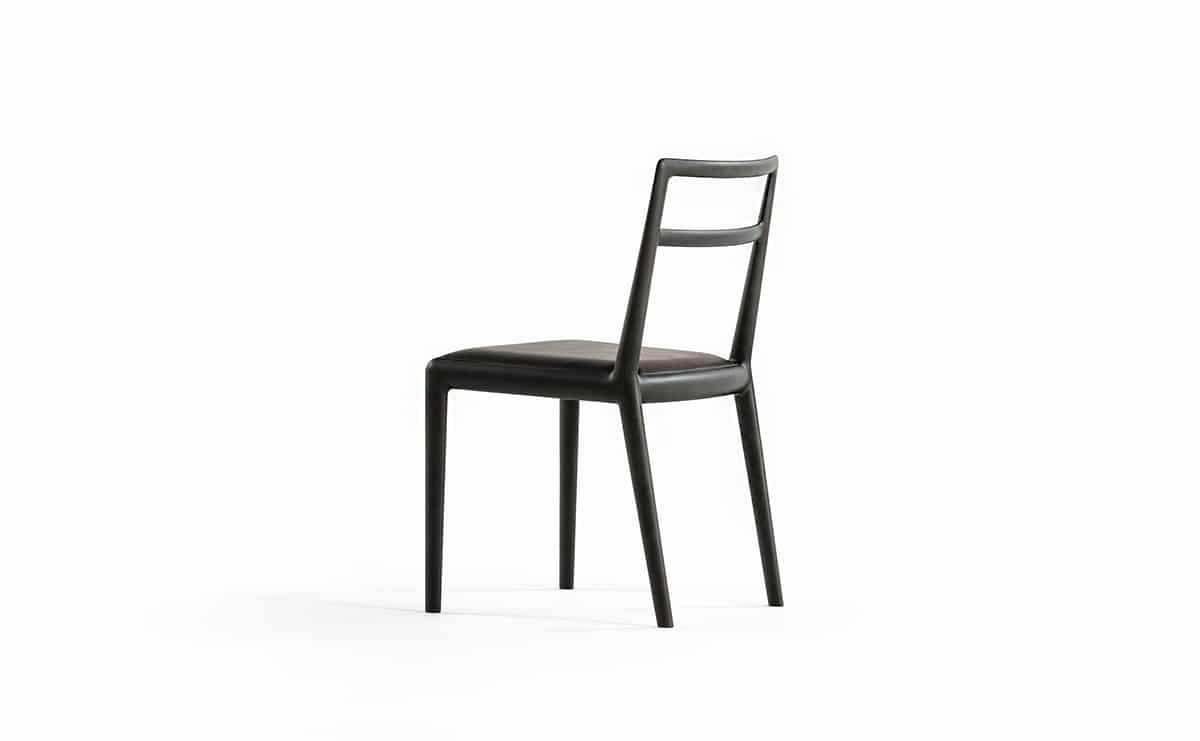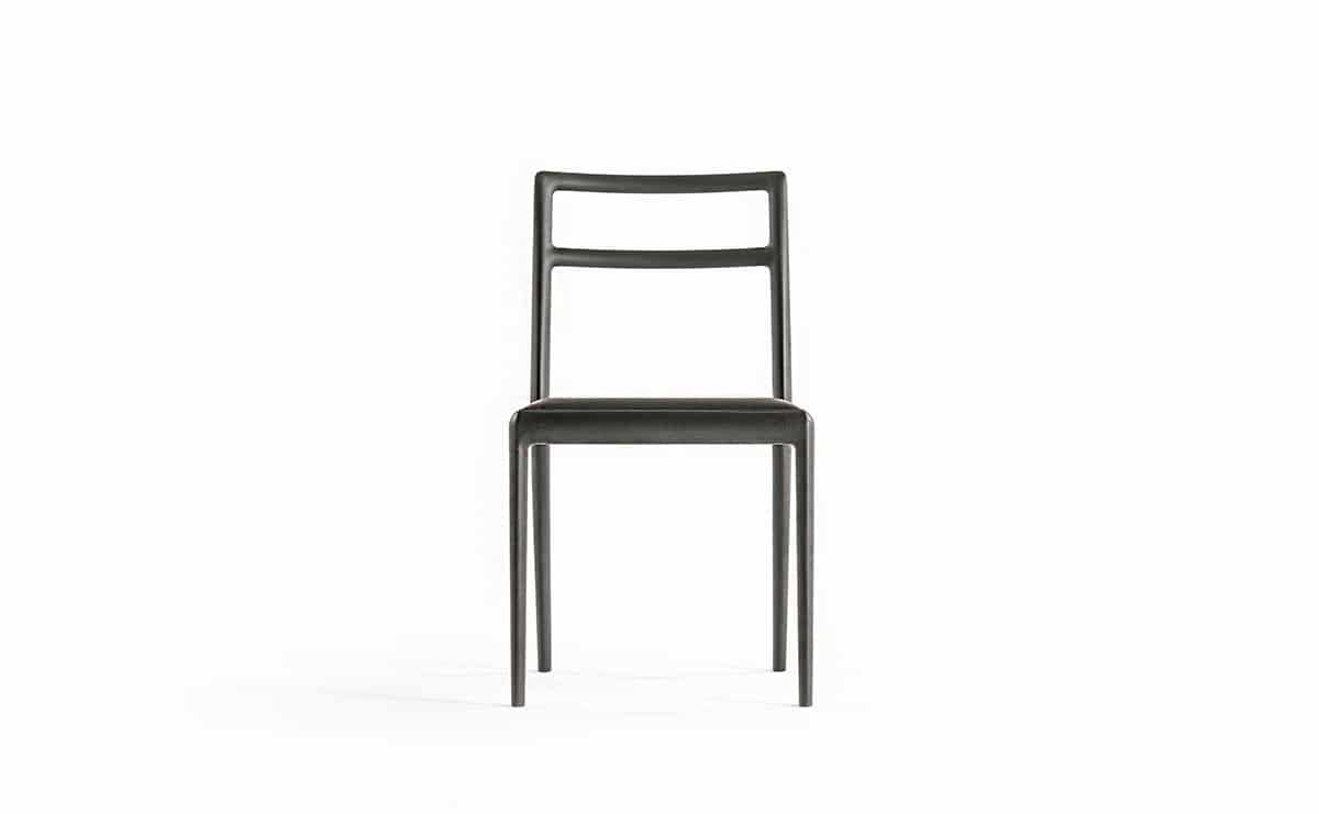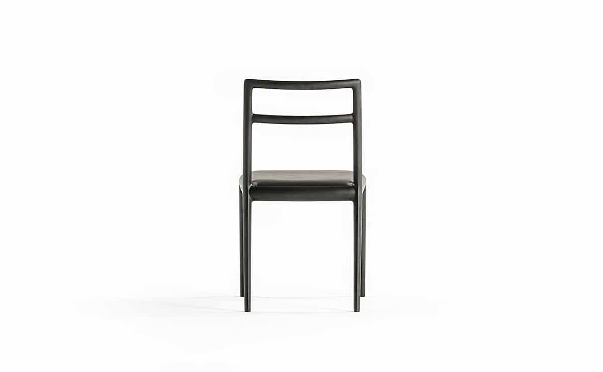 前脚と座枠と後脚は Straight back chairと同じ形状をしていますが、 背柱は途中からねじれ、背中を回り込むよう立ち上がっています。樹木の枝がひねりながら伸びている姿のように、後脚から背柱は緩やかなカーブを描いています。そうすることで優しい背当たり感が得られ、視覚的にも1 本の無垢材を彫刻のように削り出した美しさが表現できました。