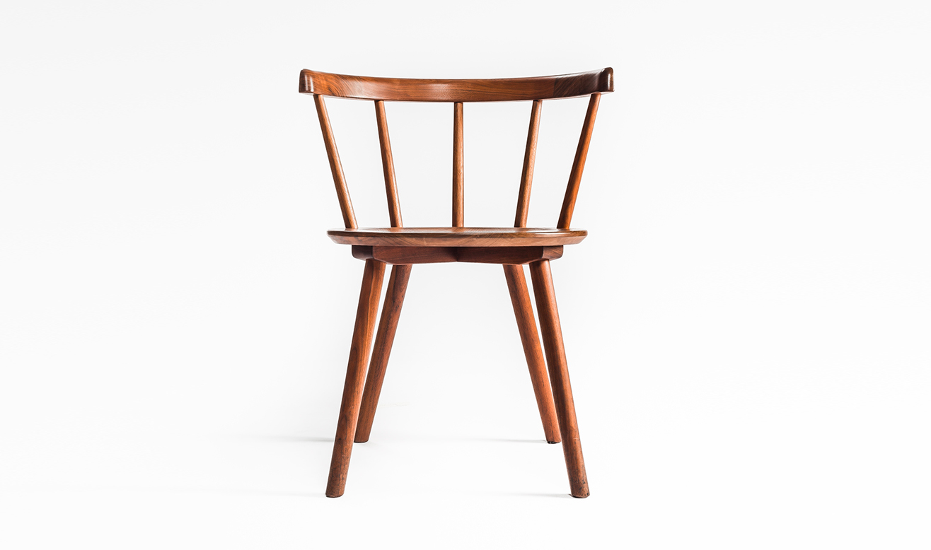 全ての部材が無垢材で構成され、スポークは座面の穴に直接刺して取り付けられています。これはウィンザーチェアの特徴であり、強度の出る接合方法です。アームがそのスポークを繋ぐようにラウンドして、ウィンザーチェアの特徴的な背もたれを形成します。
