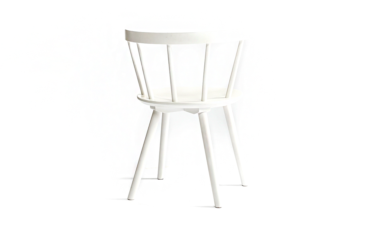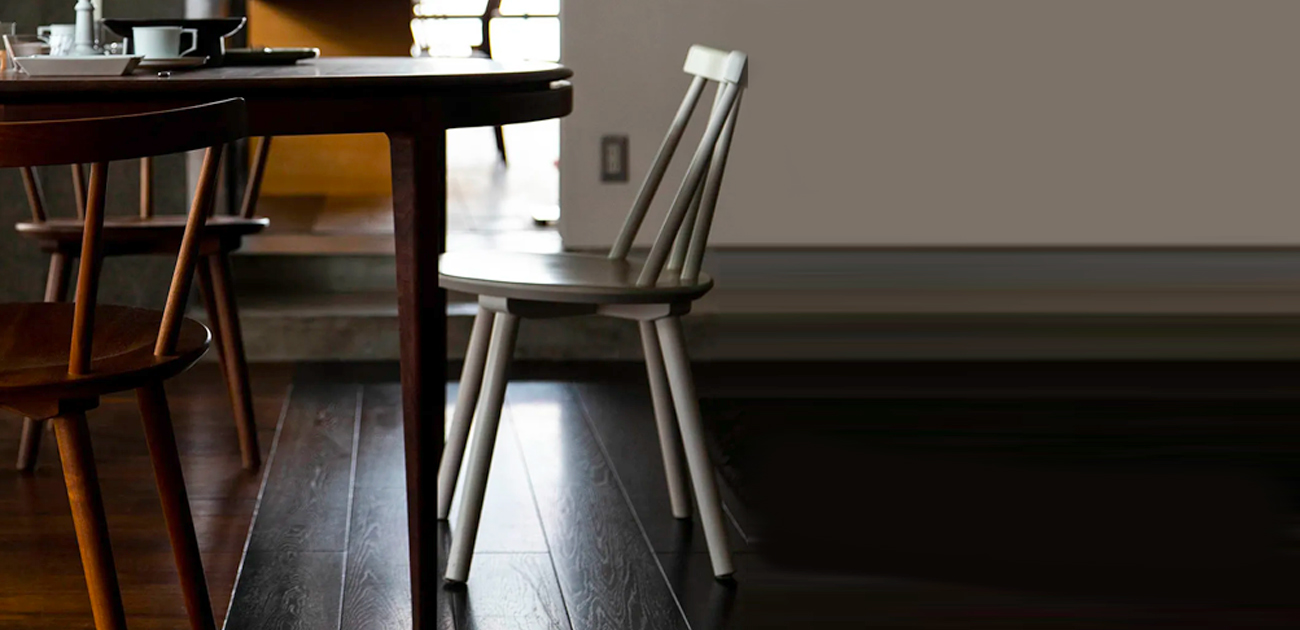 Dorf のラインナップ全てに共通する特徴は、座面裏のディテールです。元来のウィンザーチェアは座面裏に脚を直接刺す方法で接合されていましたが、それは強度を保ちにくい構造でした。そこで、Dorf は座面と脚を繋ぐクロス型の部材を用いて、その部材に脚を刺すことで強度を確保しました。さらに無垢材の座面の反り留めの効果も得て、安定感のある椅子が完成しました。