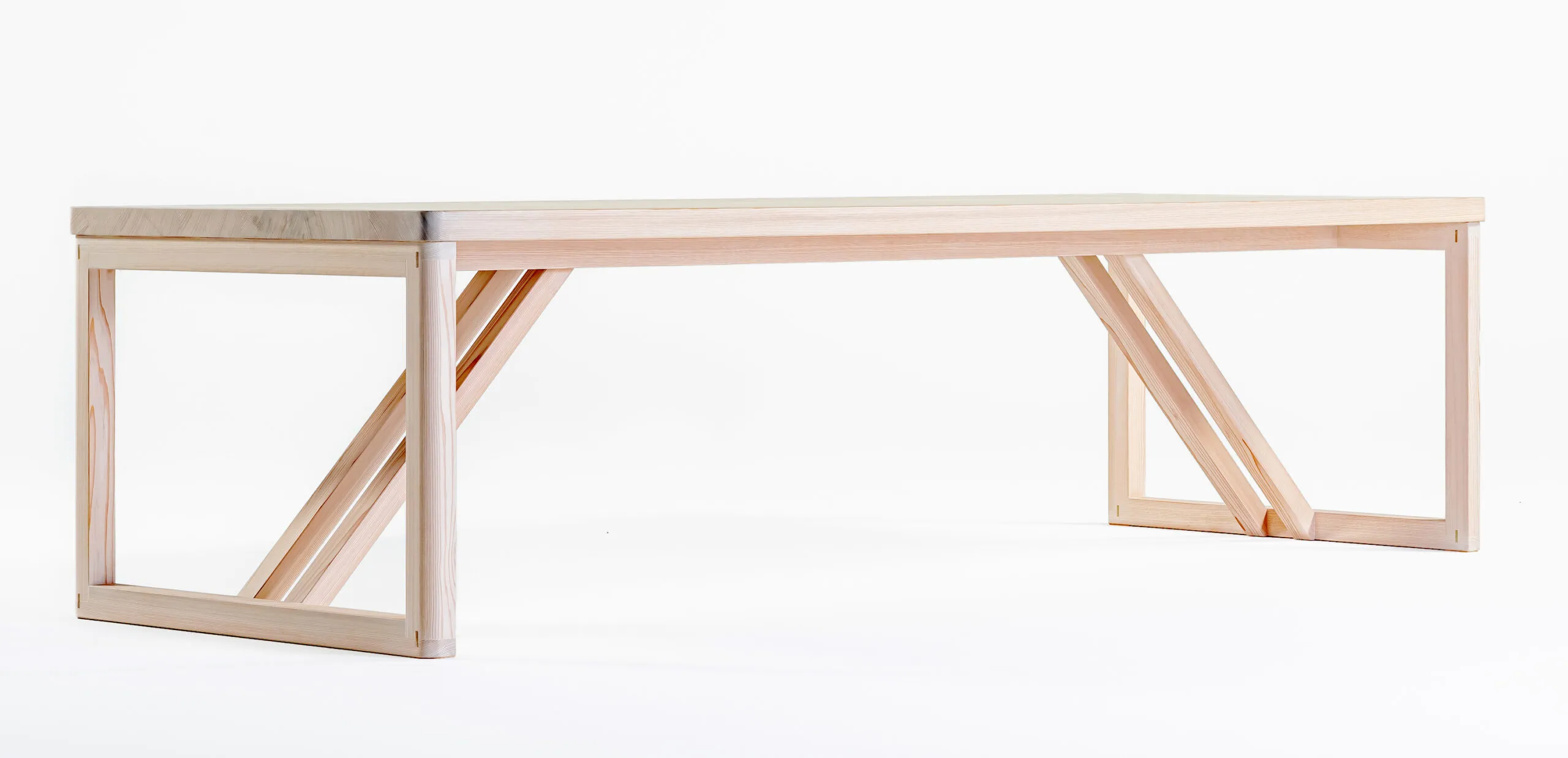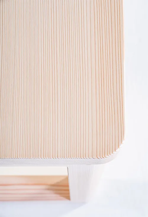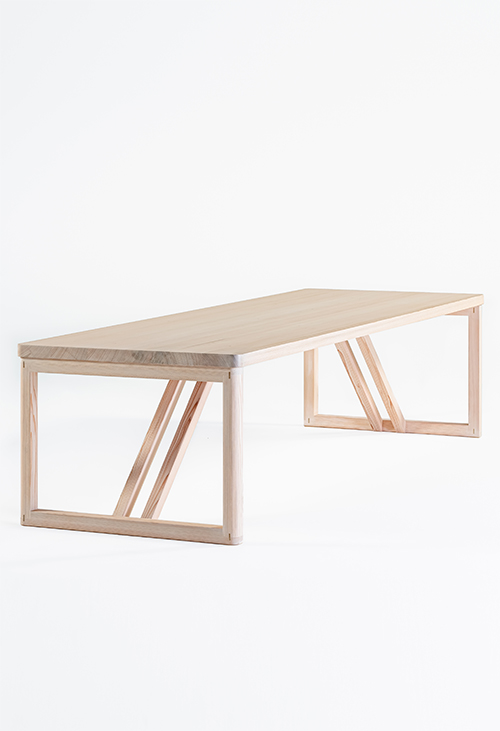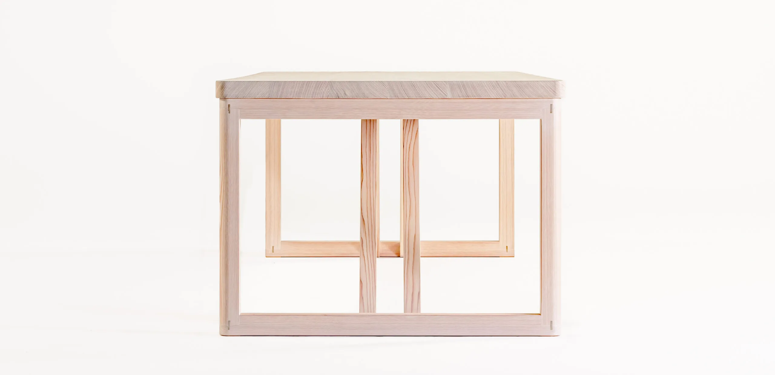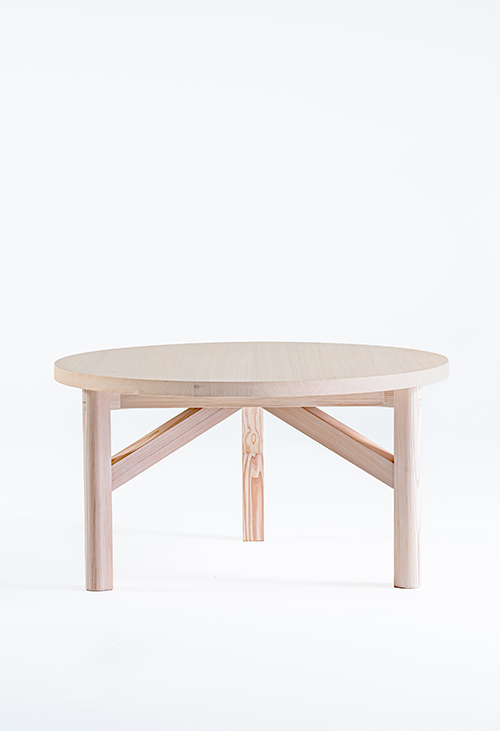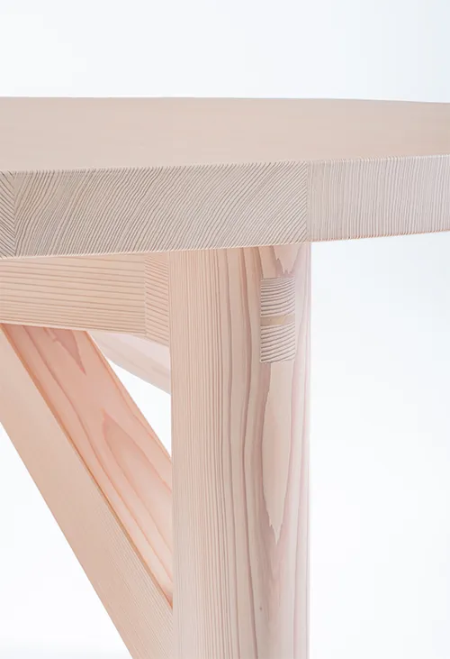 テーブルのデザインは森へのオマージュであり杉材の純粋な美しさと本質的な素材感を讃えています。脚と幕板の継ぎ目や接合部は日本の伝統的な木工技術や建築様式に着想を得た仕口構造が、デザインの重要な要素となっています。