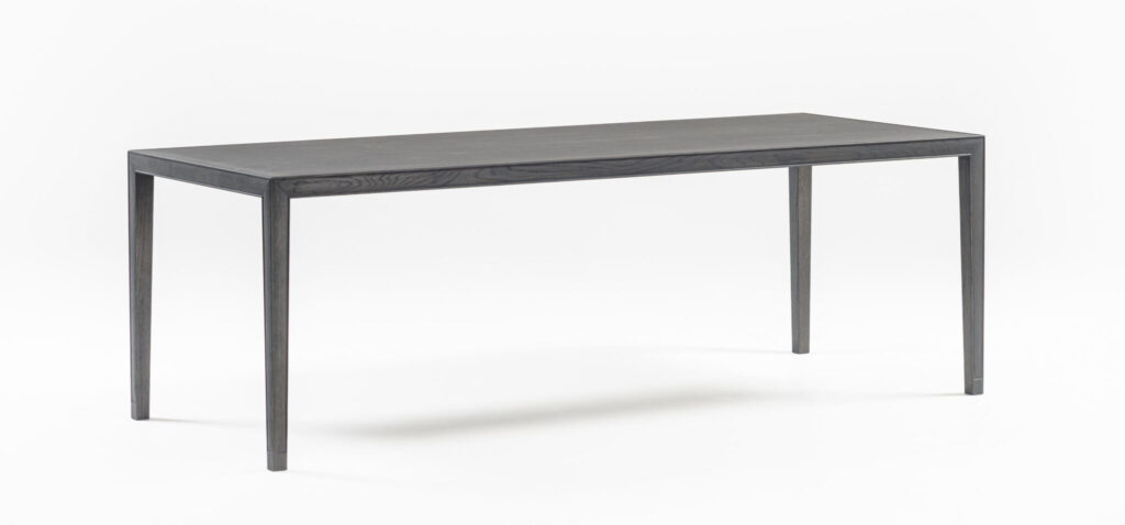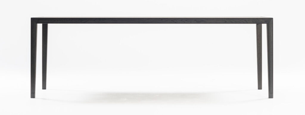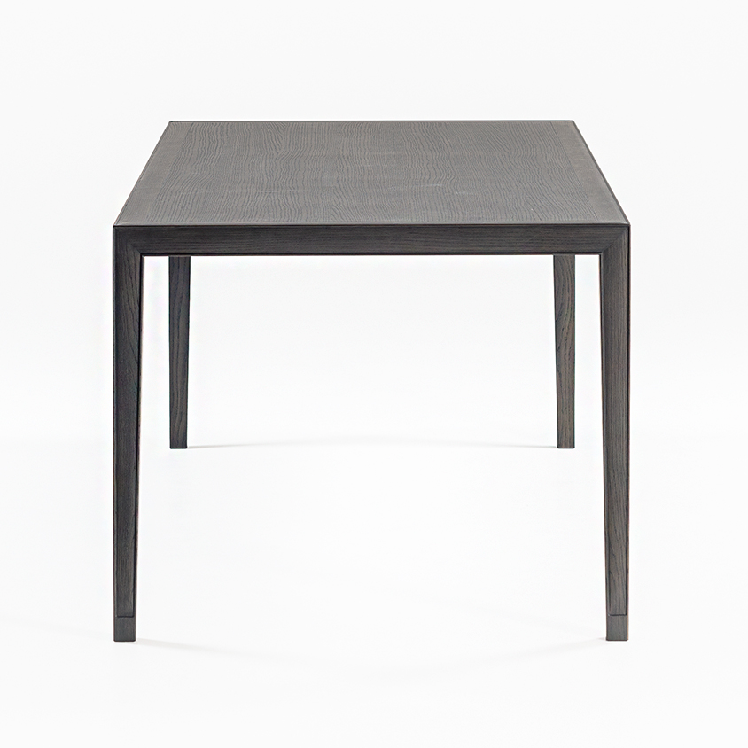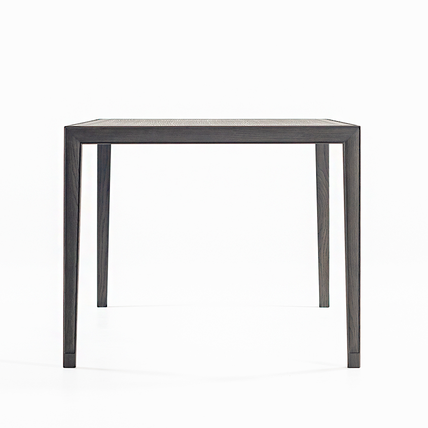 東洋的な意匠を継承させながら、天板と脚を三方留めと言う、これまで実現出来なかった工法で製作しました。三方留めは難易度がとても高い接合方法ですが、フレームに施した玉縁の意匠をもっとも美しく表現できる工法です。ガラス天板タイプも用意し、東洋的な空気感の中に洗練さを加えました。